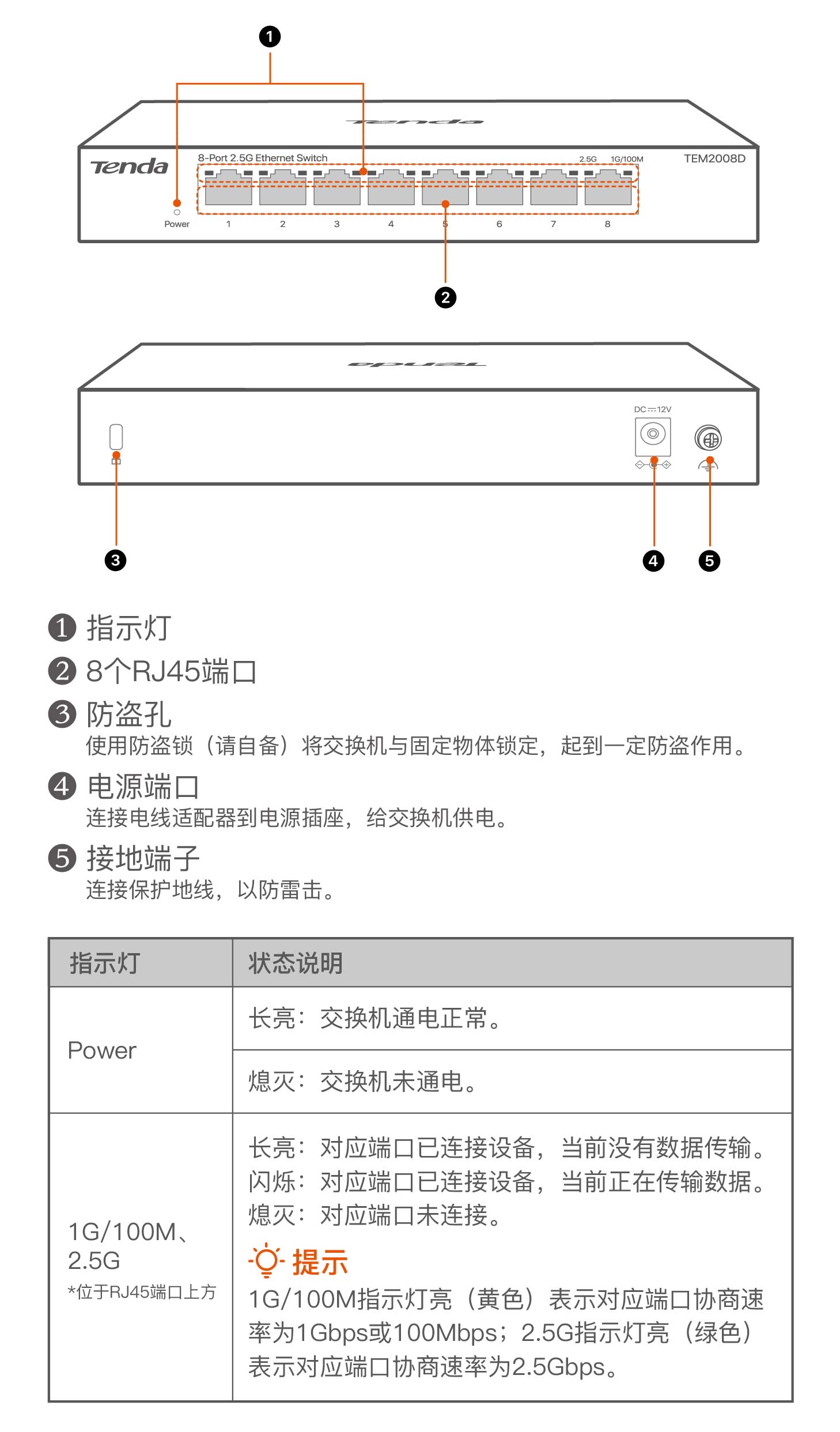 4 指示灯、端口说明